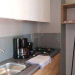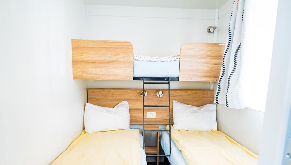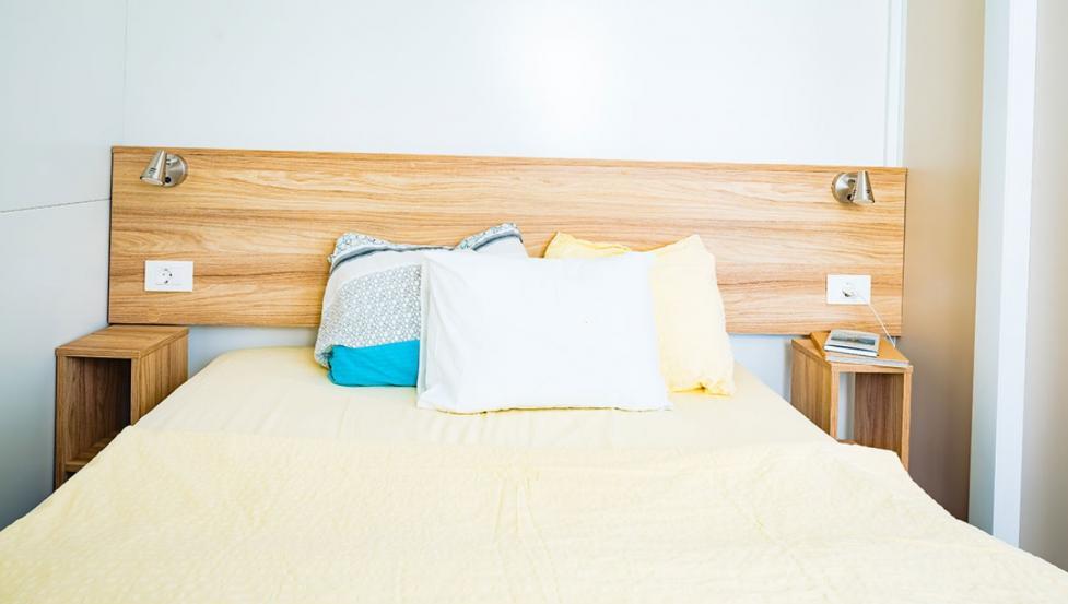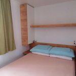 Namestitev: MH TIP A+ – 24 M2: Velikost: 8,0 x 3,0 m (24 m2), max: 4 odrasli + 2 otroka, 2 spalnici – ena s francosko posteljo in ena s tremi posteljami za eno osebo (pograd), bivalni prostor in popolnoma opremljena kuhinja (pomivalni stroj, plinski štedilnik, hladilnik z zamrzovalnikom, korito za pomivanje posode), posode za kuhanje za maksimalno 6 oseb, Sat-tv, kopalnica z umivalnikom, tušem in WC-jem, klimatska naprava, pokrita terasa z mizo in stoli, 2 ležalnika.